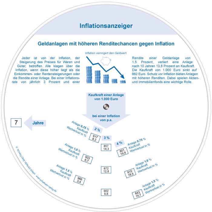 Bei einer angenommenen jährlichen Inflation von 3 % sinkt die Kaufkraft eines Kapitals von 1.000 Euro in 7 Jahren auf 813 Euro, der Wertverlust beträgt 18,7 %. Werden die 1.000 Euro mit einer jährlichen Rendite von 1,5 % angelegt, beträgt die Kaufkraft nach 7 Jahren 902 Euro, der Wertverlust 9,8 %.