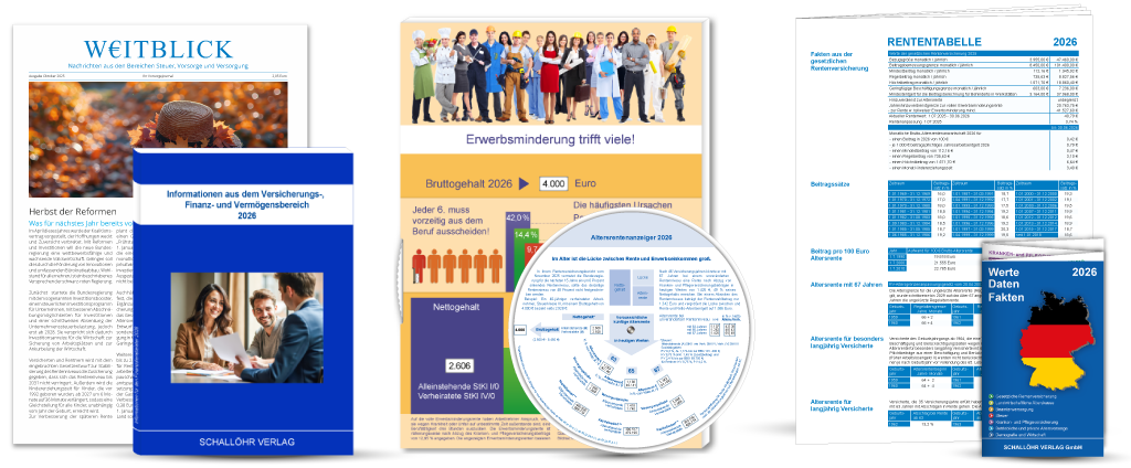 Stand: Januar 2026 Sie kennen sicher das Problem, dass wichtige Daten oftmals nicht übersichtlich zur Verfügung stehen. Mit dem Faltblatt "Werte-Daten-Fakten" haben Sie alle wichtigen Informationen und Beitragssätze schnell zur Hand. Inhalt Gesetzliche Rentenversicherung Beamtenversorgung Steuer Kranken- und Pflegeversicherung Betriebliche und private Altersvorsorge Demografie und Wirtschaft Format Das speziell für den Finanzdienstleister entwickelte Faltblatt enthält auf 7 Seiten die wichtigsten Zahlen und Informationen. Es erscheint im eingeklappten Format 9,2 cm x 14,8 cm und passt perfekt in jede Jackentasche.
